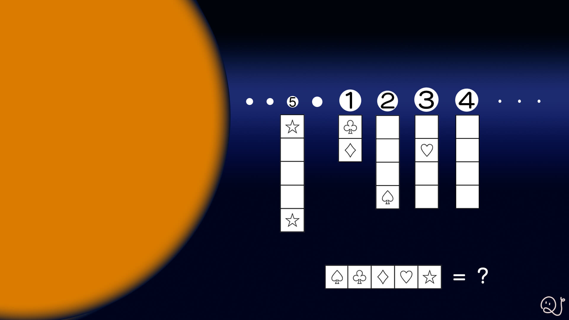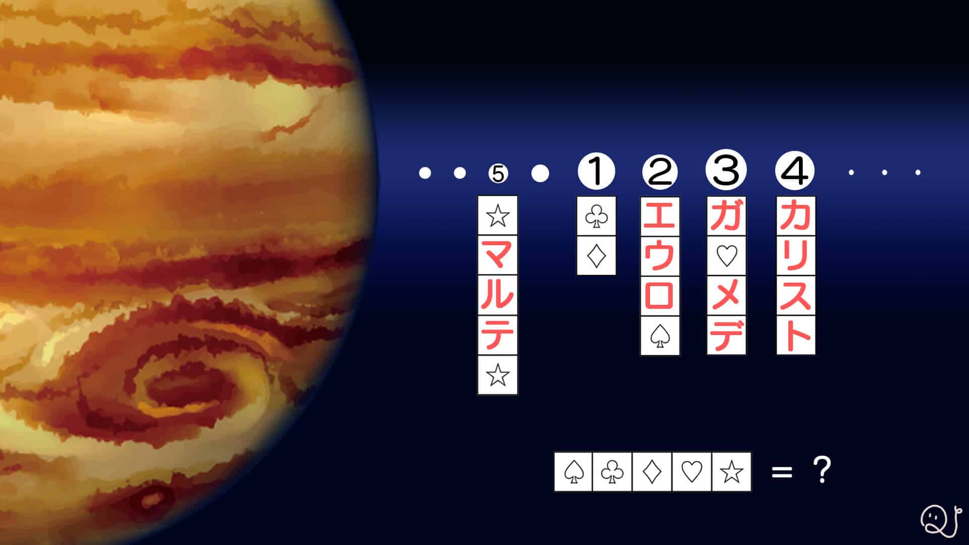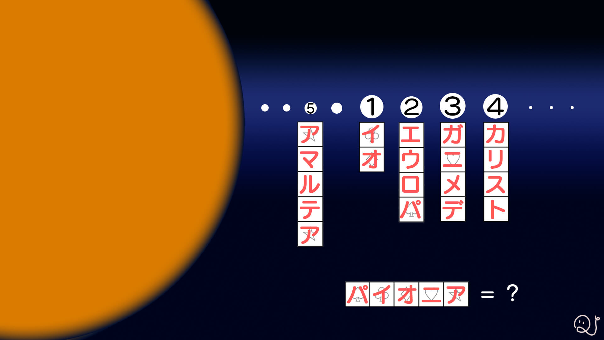 一番左の大きいのは木星、その右に並ぶ小さな円は木星の衛星を表しています。 ①~⑤に木星の第1衛星から第5衛星の名前を当てはめると、?に入る言葉は「パイオニア」になります。