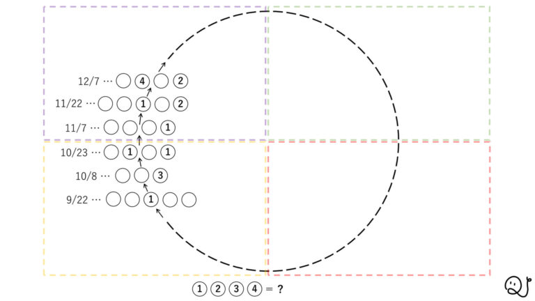 残念! 図は1年間と四季を表しており、それぞれの季節は二十四節気によって区切られています。 日付に該当する2024年の二十四節気を空欄に当てはめると、?に入る言葉は「うつろい(移ろい)」になります。