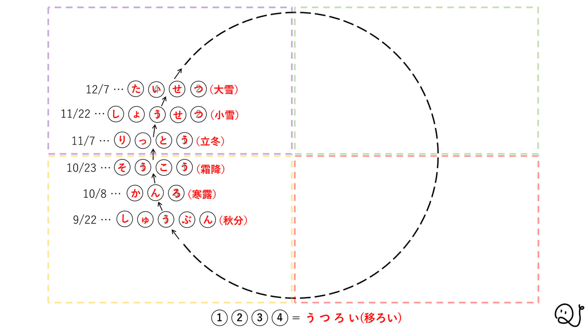 大正解っ! 図は1年間と四季を表しており、それぞれの季節は二十四節気によって区切られています。 日付に該当する2024年の二十四節気を空欄に当てはめると、?に入る言葉は「うつろい(移ろい)」になります。