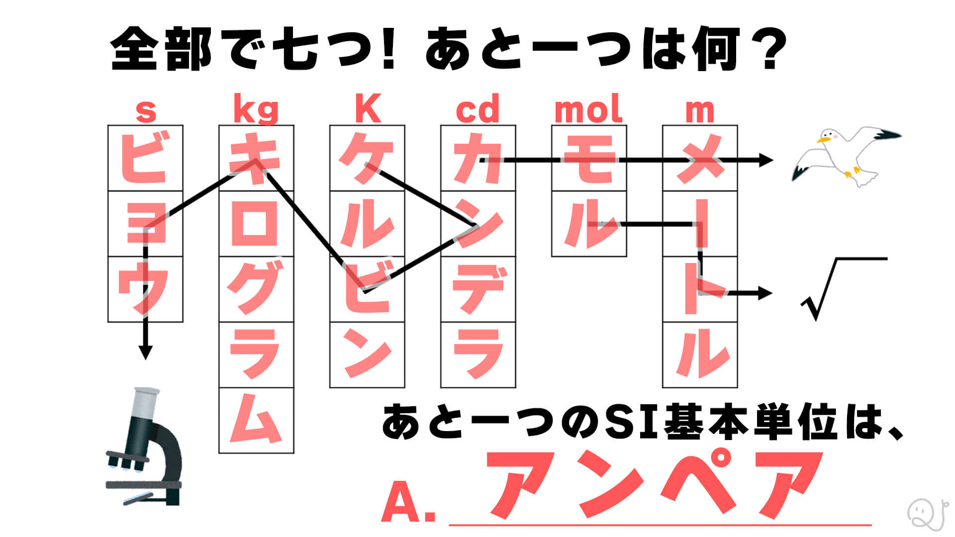 矢印が通る「ケンビキョウ」「カモメ」「ルート」の文字と一致するようにSI基本単位の名前を当てはめると「アンペア」が無いことが分かるので、答えは“アンペア”となります!