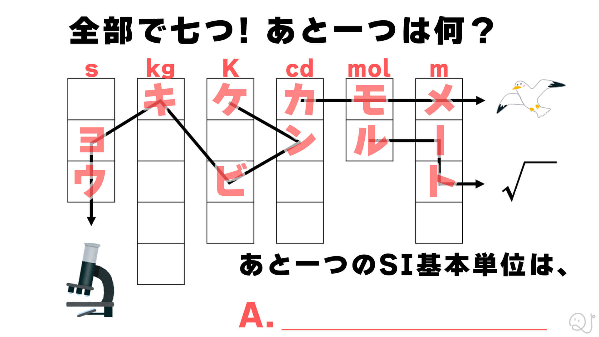 矢印が通る「ケンビキョウ」「カモメ」「ルート」の文字と一致するようにSI基本単位の名前を当てはめると、一つ足りないものがあるのでそれが答えです。