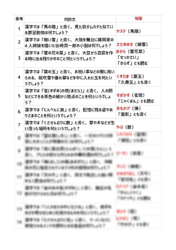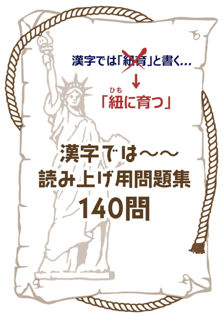 早押しクイズをゲームなどで行う場合、【漢字では「紐育」と書く…】のように出題されますが、この問題集では【漢字では「紐(ひも)に育つ」と書く…】のように読み上げに適した問題集となります。