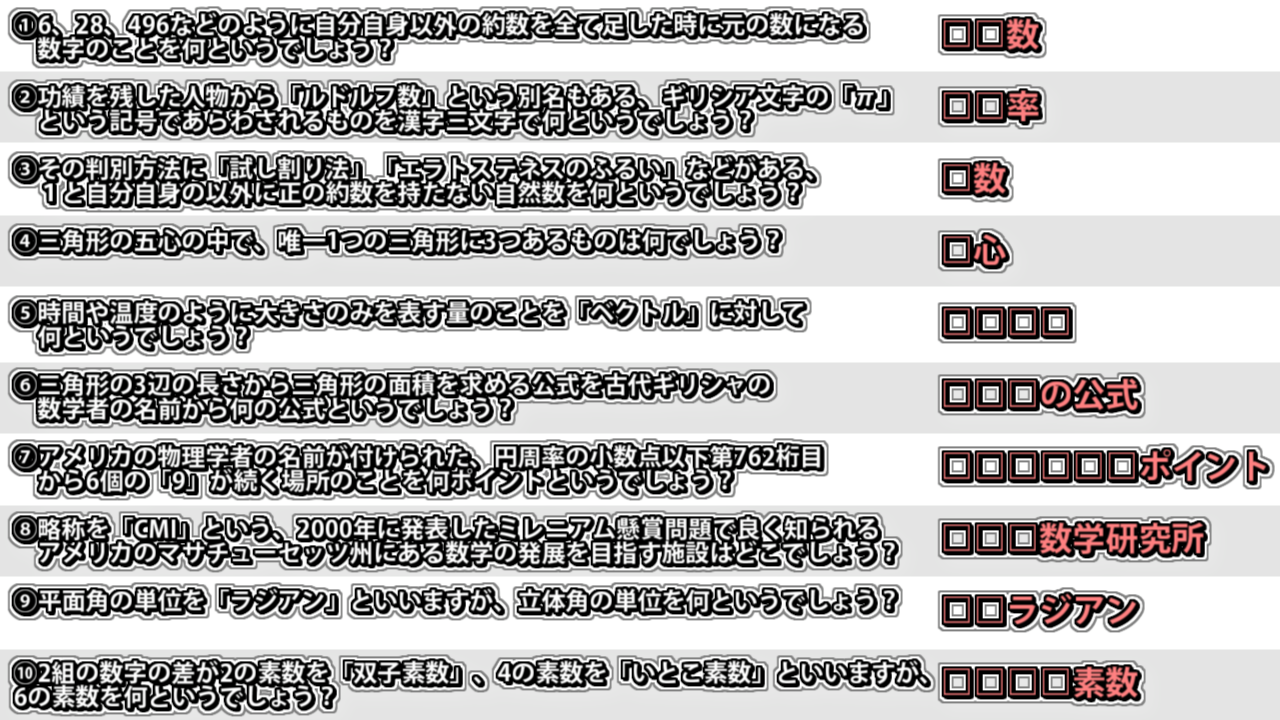 - ②功績を残した人物から「ルドルフ数」という別名もある、ギリシア文字の「π」という記号であらわされるものを漢字三文字で何というでしょう?