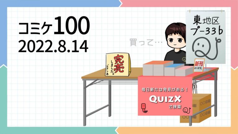 そして今回QuizXはというと、2022年8月14日(日)東地区“プ”ブロック33-bに出展します。