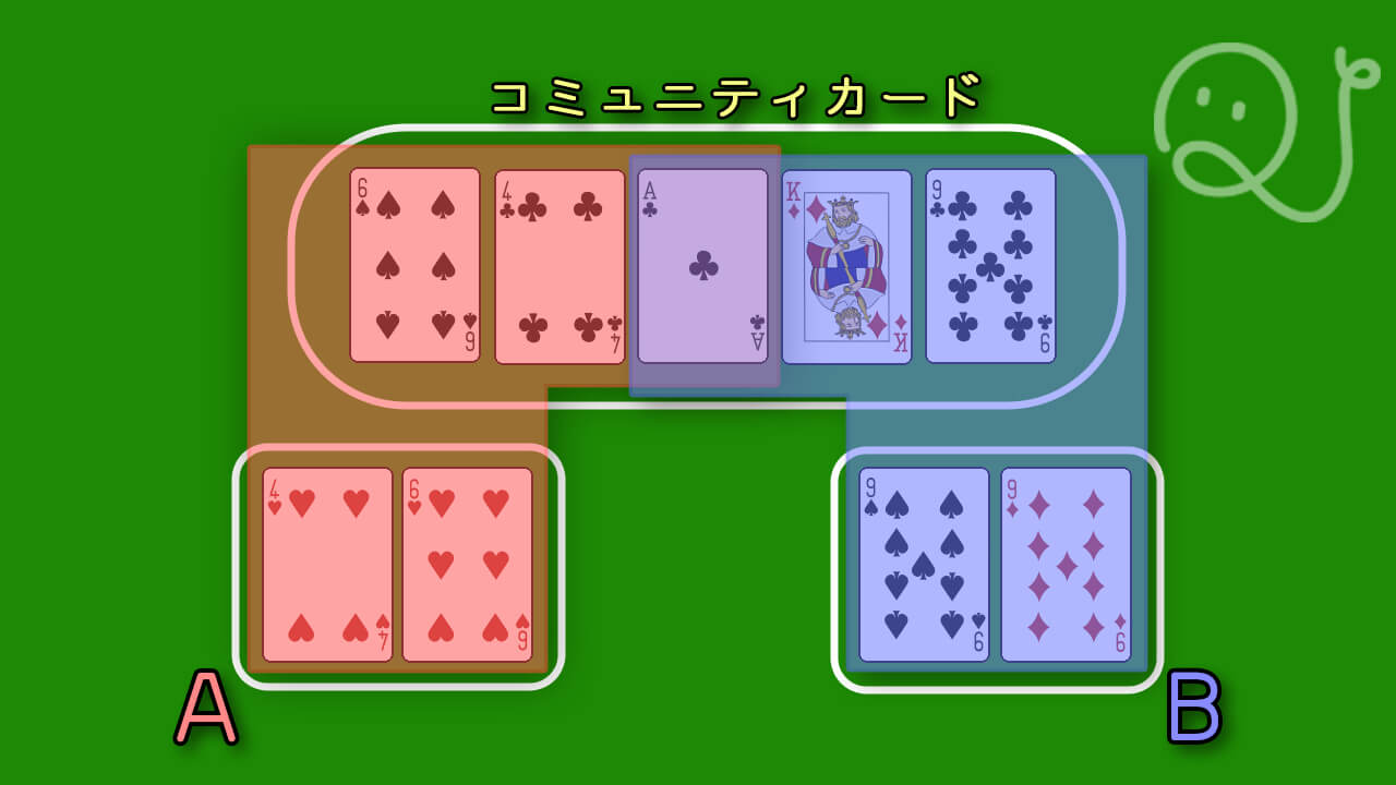 かなりざっくり説明すると、 手札2枚(ホールカード)と共通の場の5枚(コミュニティカード)の合計7枚の中から5枚で役を作ります。