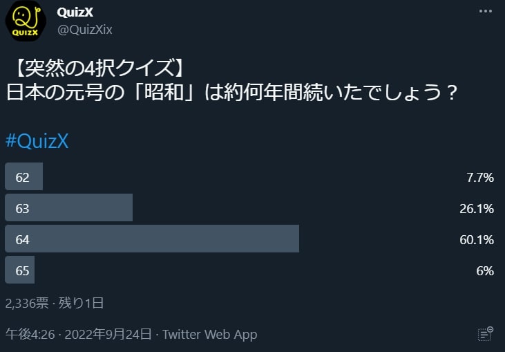 日本の元号の「昭和」は約何年間続いたでしょう?#QuizX— QuizX (@QuizXix) September 24, 2022