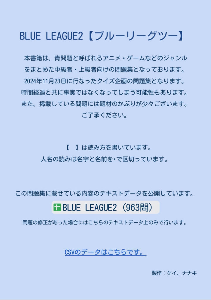 BLUEケイ アニメ・ゲームなどの問題集『BLUE LEAGUE』を制作しました! 全446問。この問題集に載せているものを3択にアレンジして5問出題します。 電子書籍をクイズ宅配便(Q宅)・BOOTHにて販売中です! […]