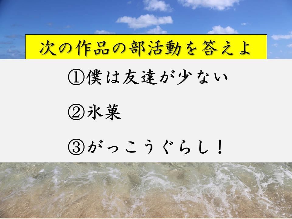 Q2 次の作品の主人公が入っている部活 上から3つ順番に答えよ