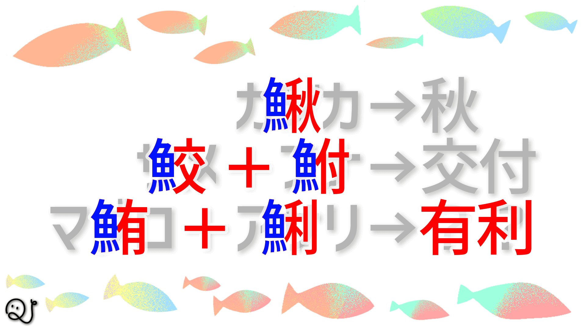 大正解っ! お見事です!! 全て漢字に直して魚へんを取り除くという法則でした! 鰍(カジカ)→秋 鮫(サメ)+鮒(フナ)→交付 鮪(マグロ)+鯏(アサリ)→有利