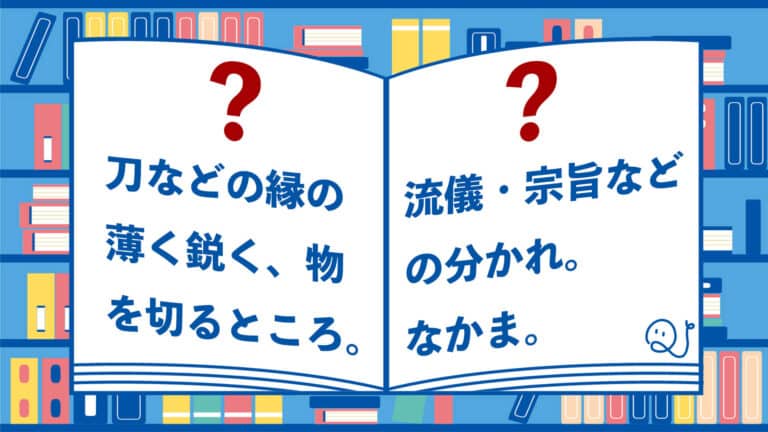 刀などの縁の薄く鋭く、物を切るところ。 流儀・宗旨などの分かれ。なかま。 この2つは同音異議語です!共通するひらがな1文字の読み方は?